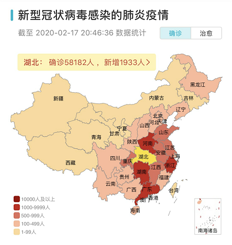 从腾讯健康数据中可以看到,截止2020年2月17日,全国总计确诊人数达到70641例,其中湖北省内确诊58182例,而其中武汉市确诊41152例,占比70.7%。